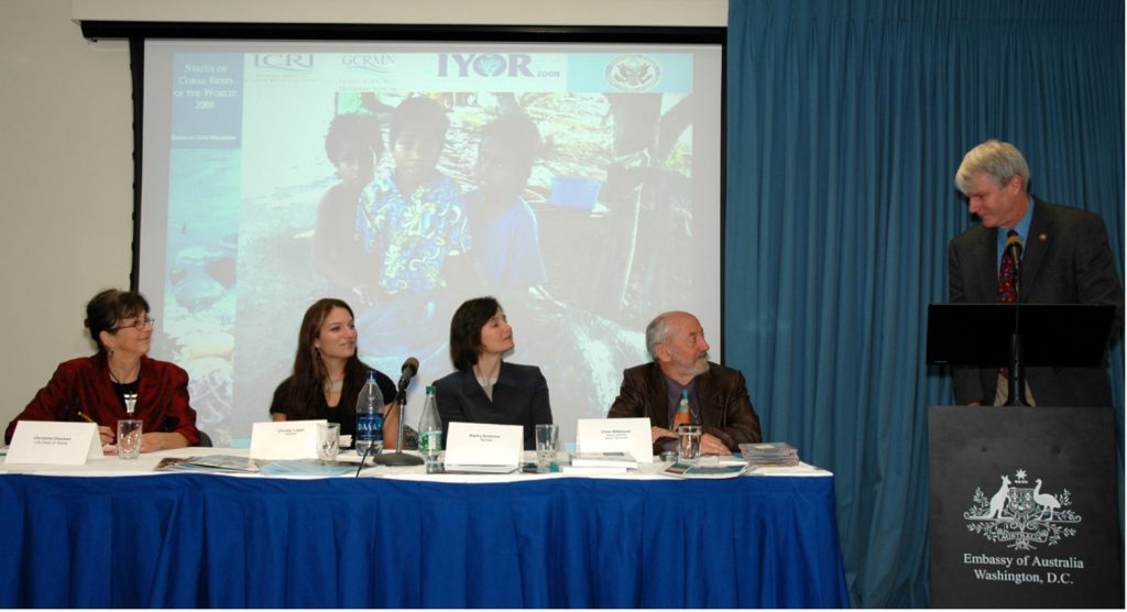 Launch of the Status of Coral Reefs of the World: 2008 report at the Australian Embassy in Washington DC. At the lectern: Dr Brian Baird (Congressman), from left: Christine Dawson (US Dept. of State), Christy Loper (SocMon Coordinator, NOAA), Kacky Andrews (NOAA) and Clive Wilkinson (AIMS, GCRMN Coordinator).