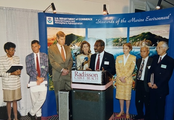 Launch of ICRI at the First Conference of the Parties of the Biodiversity Convention in 1994 in Nassau. From left: Deputy Director of the Nature Division, Ministry of Environment Alain Megret (France), Senator Tim Wirth (USA), Ambassador for the Environment Lyn Holowesko (Bahamas), Minister Easton Douglas (Jamaica), Ambassador for the Environment Penny Wensley (Australia), Minister Angel Alcala (Philippines), Ambassador to the UN-NY Hisashi Owada (Japan).